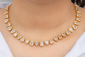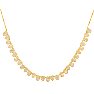This luxurious necklace features a continuous row of pear-shaped clear stones, each individually set in smooth gold bezels. The teardrop stones are arranged in an alternating pattern that creates a graceful flow around the neckline, with each stone catching and reflecting light beautifully. The substantial gold framework and brilliant stones combine to create an opulent statement piece with timeless elegance.
