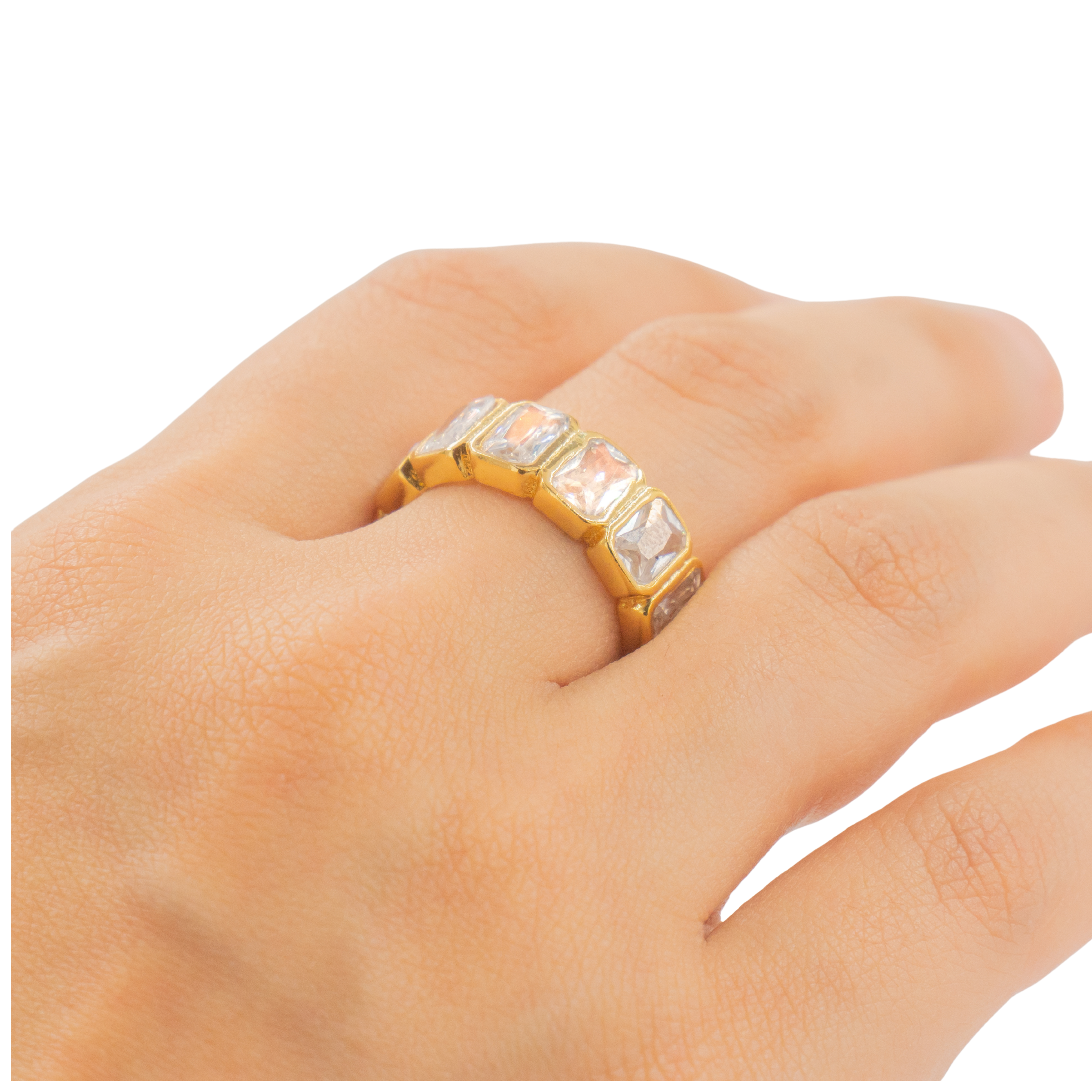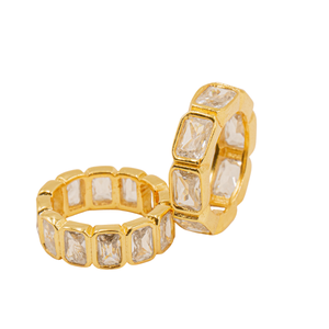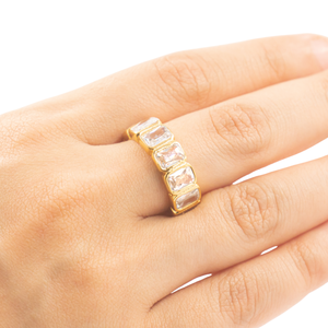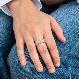 This stunning statement ring features emerald-cut clear stones set horizontally in a substantial gold band. The rectangular stones are aligned in a row, creating a bold and eye-catching design that spans across the finger. The combination of the substantial gold setting and brilliant stones makes this piece a luxurious everyday essential or special occasion showstopper.