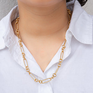 This modern chain necklace features a bold paperclip link design with alternating oval and circular links in polished gold. The chunky yet refined chain creates a contemporary statement that sits beautifully at the neckline. The substantial links and smooth finish give this piece a versatile edge that transitions seamlessly from casual to dressed-up looks.